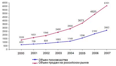 Рисунок 1 - Динамика отечественного производства и продаж мебели на российском рынке, млн. долл.